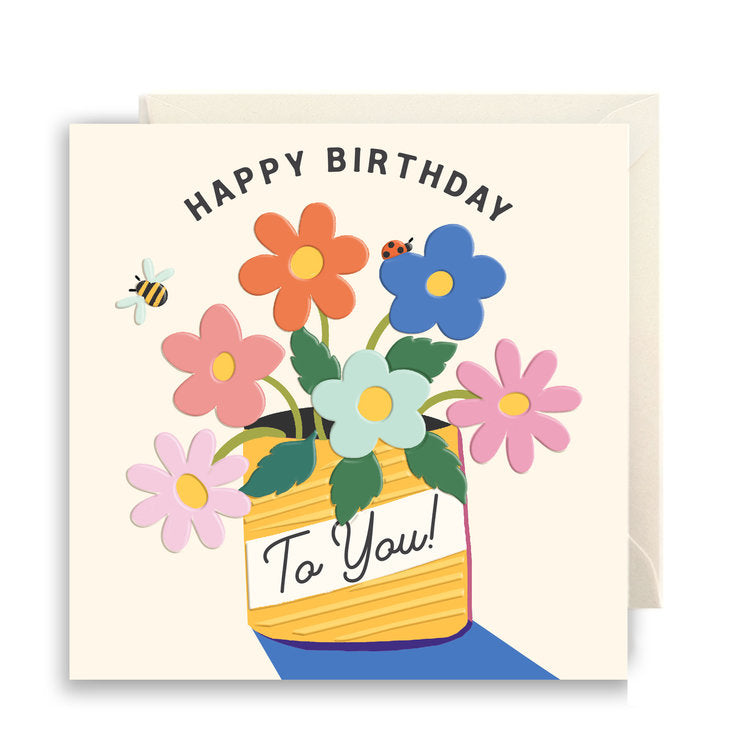 A bright and contemporary Birthday Card featuring arrangement of daises in a vintage yellow tin. Paired with a soft white envelope.