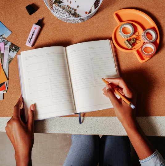 192 Pages Planner A5 Hardcover, Silk ribbon placeholder. Pages throughout for setting & reflecting on goals. 16 week-view – each week has 3 overview pages and 7 daily pages (one page per day) for your daily schedule and to-dos, 9 lined pages for extra notes.