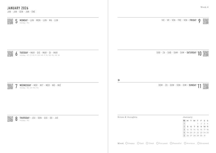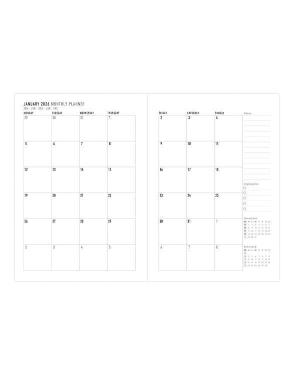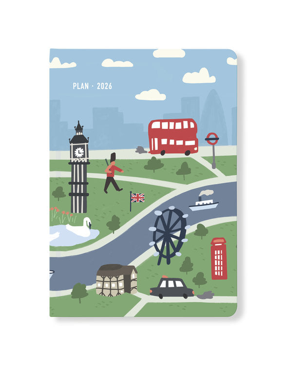 This Letts of London diary is a week to view format. It features many sustainable details. The textured cover with a matt finish features a gorgeous illustration, sending your thoughts towards exciting city breaks. The covers have rounded corners. The diary is printed in grey and runs from January to December 2026. There is a monthly calendar before each month and To Do pages and Notes at the end of each month.