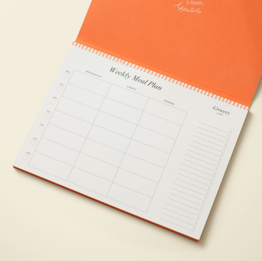Softback Meal Planner with 60 weekly pages with tear-off shopping lists (Monday-Sunday).