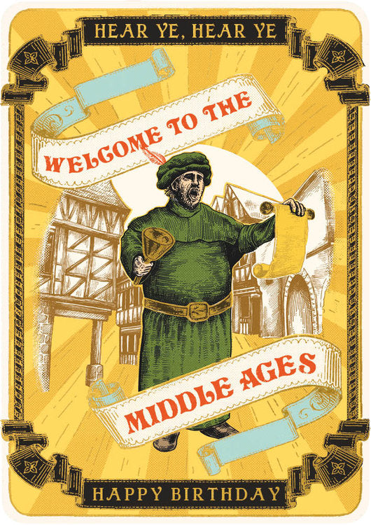 Make them laugh on their Birthday with this witty medieval period inspired Birthday Card. This card features die-cut, emboss and gold foil. Comes with a ivory envelope.