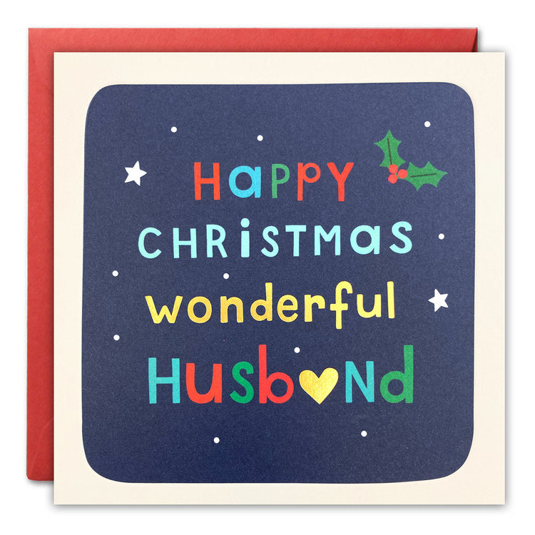 A cute Christmas relations card for a husband, the image on the front of the card features the words 'Happy Christmas Wonderful Husband'. Supplied with a matching envelope.