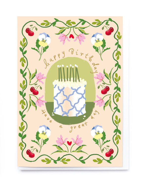 This chic card is decorated with beautiful coloured flowers, leaves and cherries to make a perfect Birthday Card for that stylish person to wish them a Happy Birthday! Supplied with a white envelope.