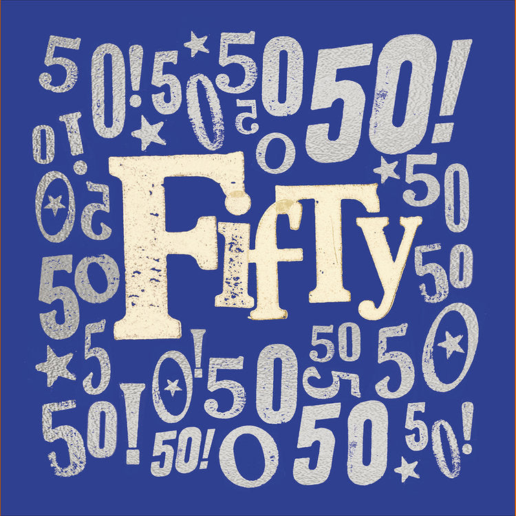 Celebrate being 50 with this bold card with blue and silver writing! Supplied with a matching envelope.