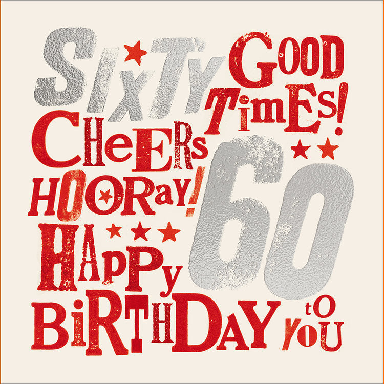 Celebrate being 60 with this bold card with red and silver writing! Supplied with a matching envelope.