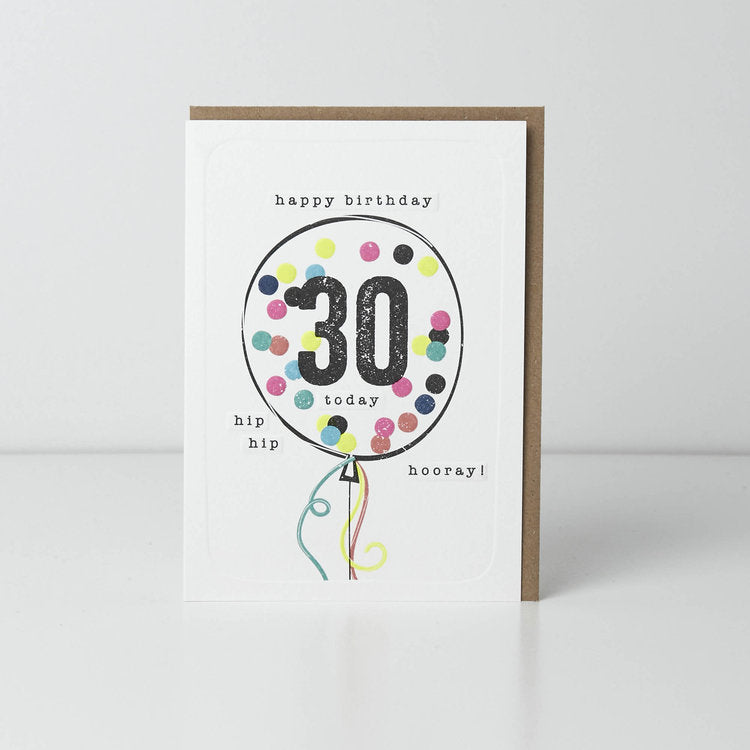 Contemporary 30 Birthday Card by Belly Button Design, appearance with pops of neon for a contemporary playful and expressive. Supplied card clasped with a kraft envelope.