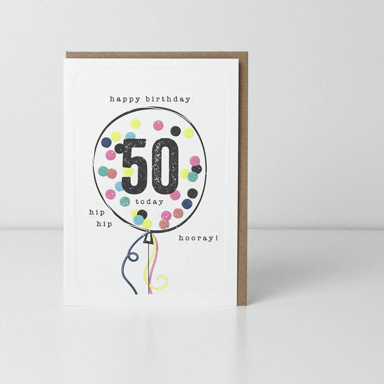 Contemporary 50 Birthday Card by Belly Button Design, appearance with pops of neon for a contemporary playful and expressive. Supplied card clasped with a kraft envelope.