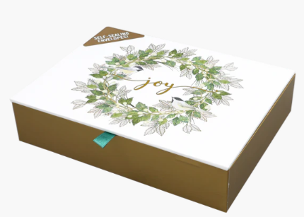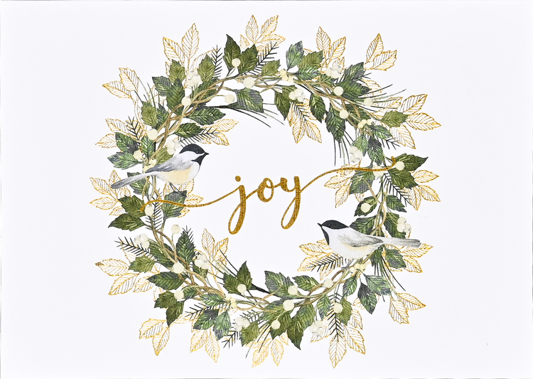 Two chickadees perch on a wreath of evergreens, mistletoe, and holly that encircles the word ''Joy'' on these charming greeting cards. Premium card set includes 20 cards and 21 envelopes, presented in a matching keepsake box.