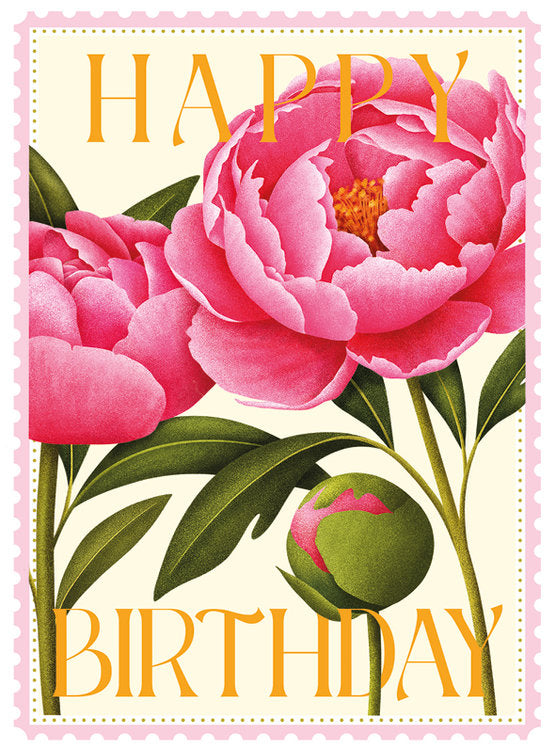 Say Happy Birthday with this gorgeous Birthday Card. This card features pink peony blooms and reads 'Happy birthday'. Comes with an ivory envelope.